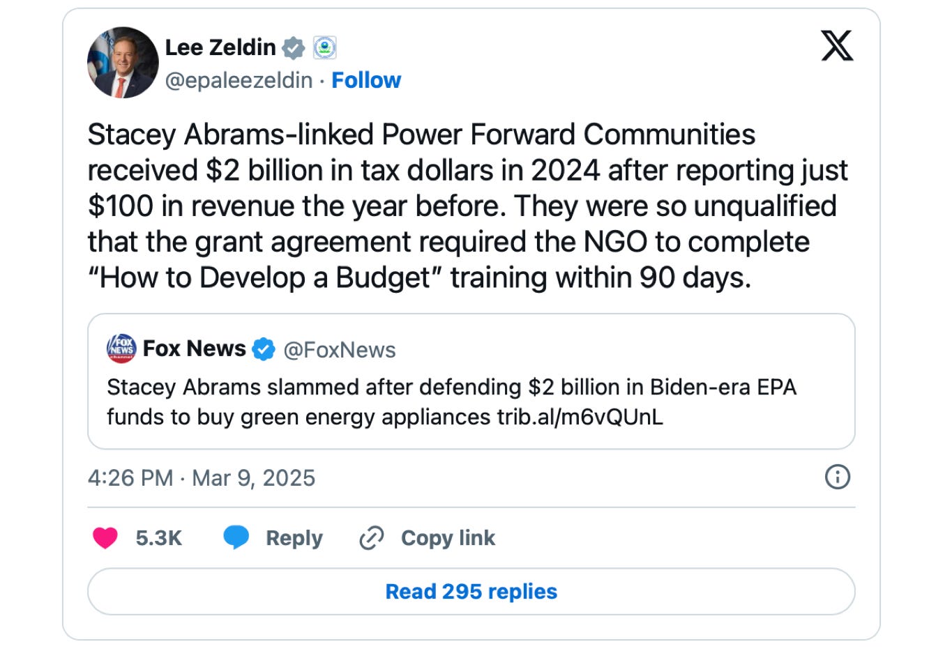 News-9 ABC ran a curious story yesterday headlined, “EPA head Zeldin grills Stacey Abrams nonprofit accused of obscuring $2 Billion Biden admin grant.” In short, shortly before President Autopen departed the office, Democrat intellectual heavyweight Stacey Abrams started a brand-new NGO with $100 in the bank that immediately got $2 billion dollars in EPA funding for promoting “green appliances.”