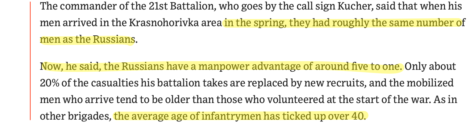 So now it’s an old man’s war. In just a few months (“since the Spring”), the Ukrainians disastrously plunged from matching Russian troop figures one-to-one to an astonishing one-to-five ratio, and the few replacement troops are mostly seasoned citizens: