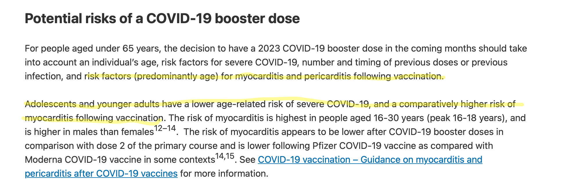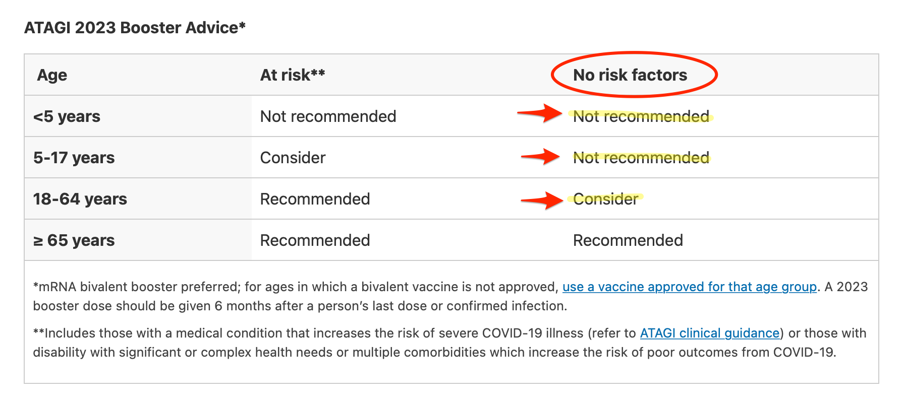 Anyway, forget about booster mandates! Nevermind! At this point in 2023, ATAGI only recommends covid shots for two groups: people aged 65+ and people 18 and over who are at-risk. The new guidelines actually recommend AGAINST covid shots for healthy kids under 18, or even for at-risk kids under five — the opposite of U.S. FDA recommendations.
