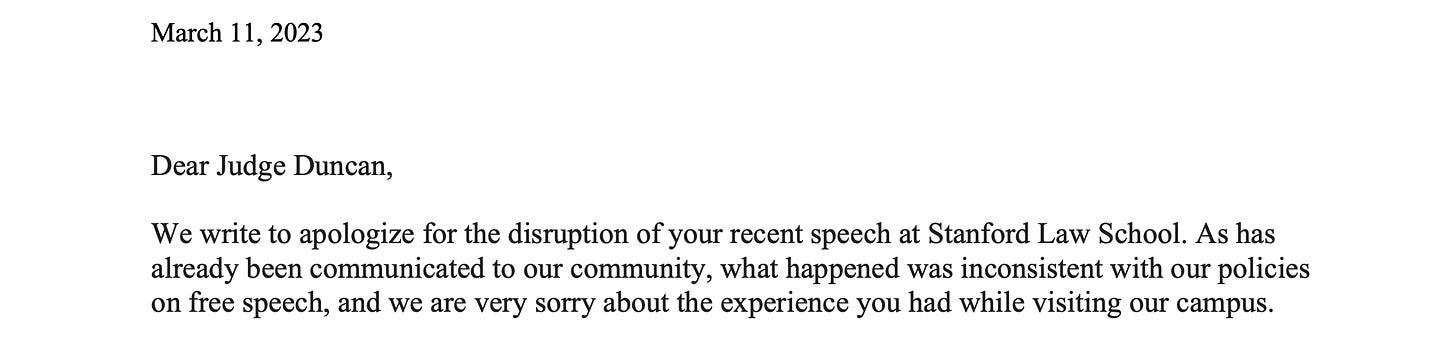 The judge’s sharp criticism of Stanford compelled the law school’s Dean, Jennifer Martinez, to transmit a formal written apology expressing the school’s regret about Judge Duncan’s ill-treatment on campus: