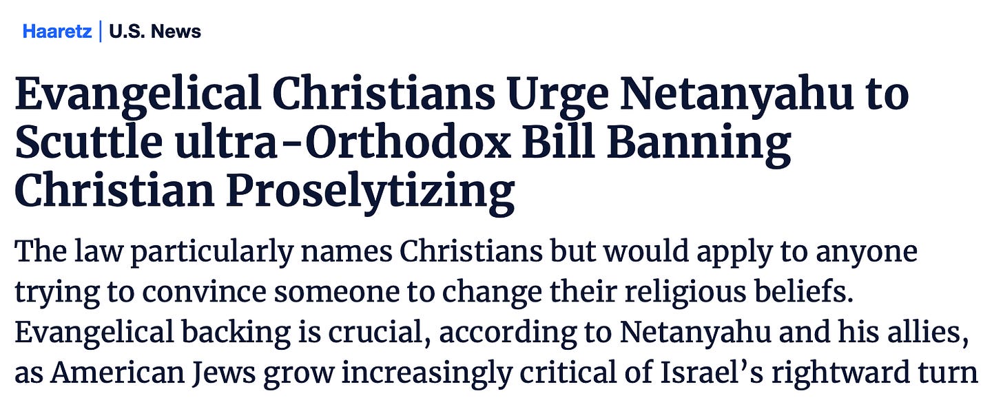 🔥 The Jerusalem Post ran a story yesterday headlined, “Netanyahu: Knesset Will Not Advance Anti-Christian Laws.”