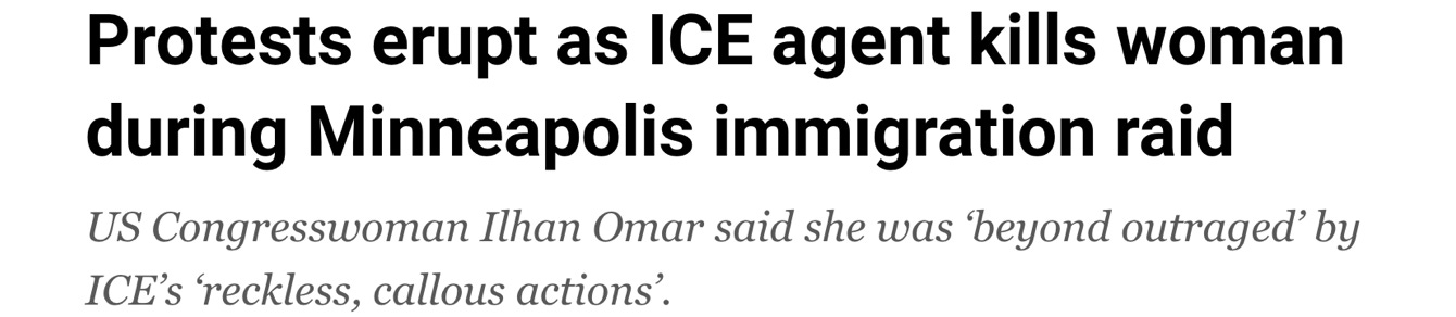 Because I am confident this developing story will appear throughout the comments if I don’t address it, I’ll spare a few words for yesterday’s regrettable death of an anti-ICE activist. The UK Guardian shot out a story headlined, “‘This is not normal’: Minneapolis on edge and angry after ICE killing of woman amid federal surge.”