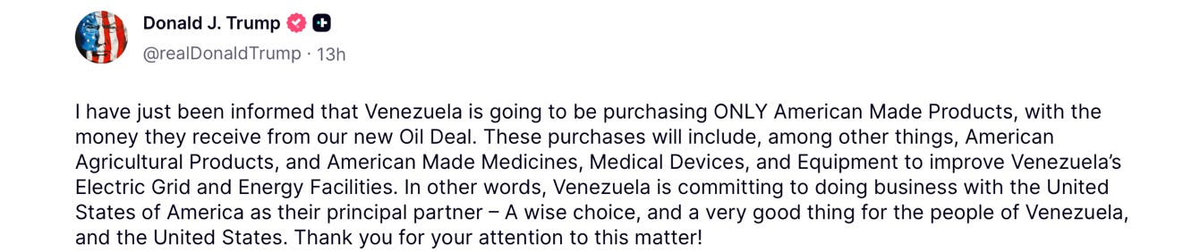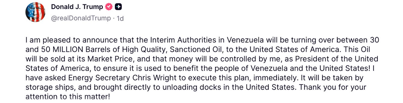 🔥 It’s still not over. In any other news cycle, this would be all anyone was talking about. The Wall Street Journal poured out a story yesterday headlined, “Trump Team Works Up Sweeping Plan to Control Venezuelan Oil for Years to Come.” The subheadline, get this, almost casually added, “President believes the effort could lower oil prices to his target of $50 a barrel.”