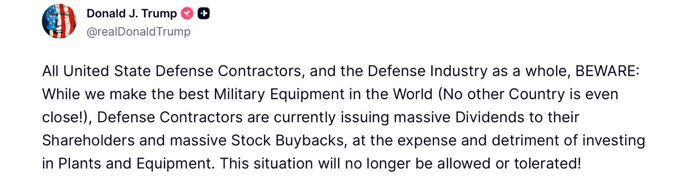 In yesterday’s post, Trump threatened action if defense companies fail to catch up on their production schedules, including capping executive pay, investing in new factories and producing more military equipment, faster. He even named a cap amount of $5 million on CEO salaries until performance improves. He called for the suspension of shareholder dividends and stock buybacks.
