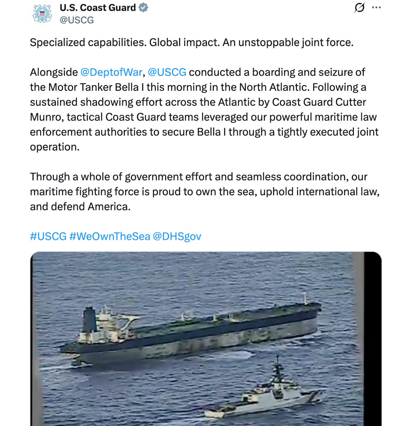 The Russian-flagged oil tanker (now owned by the U.S.) initially sailed out of Venezuela with a shady fake registration. After being trailed by suspicious Coast Guard vessels to the Arctic, the tanker’s crew hastily painted a Russian flag on its bow. Later, Moscow advised that the Bella I was being escorted by a Russian nuclear submarine. The Coast Guard intercepted it anyway, without incident.