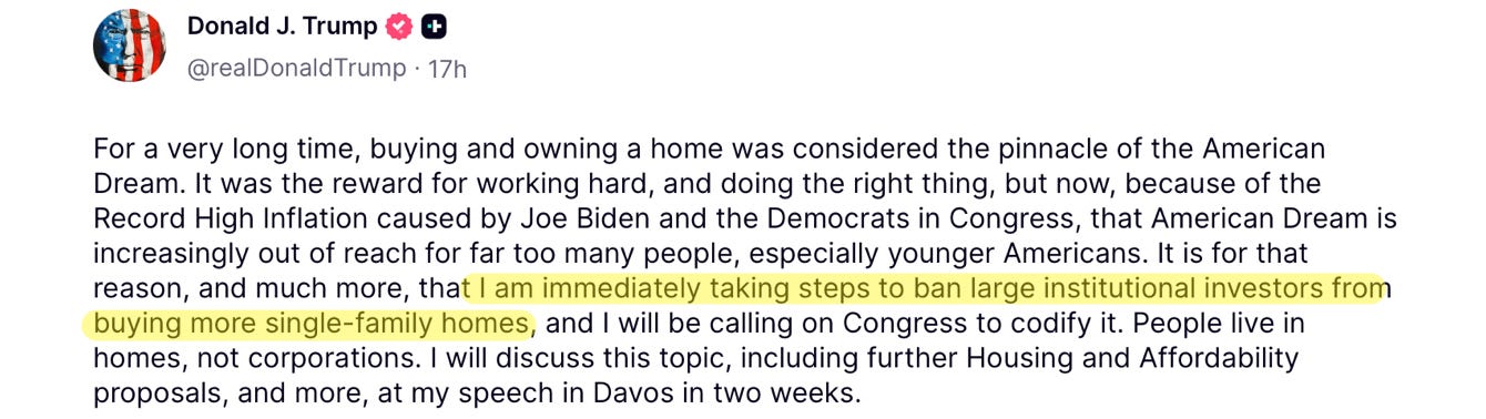 The BBC reported that shares of related property firms immediately fell yesterday after Trump’s comments. For instance, Invitation Homes, which owns single-family homes, fell -6%. BlackRock fell almost -8% on the news, but recovered somewhat after the firm forcefully denied directly owning residential homes (which is true, but misleading; BlackRock invests in certain companies and investment funds that do buy residential homes at scale).
