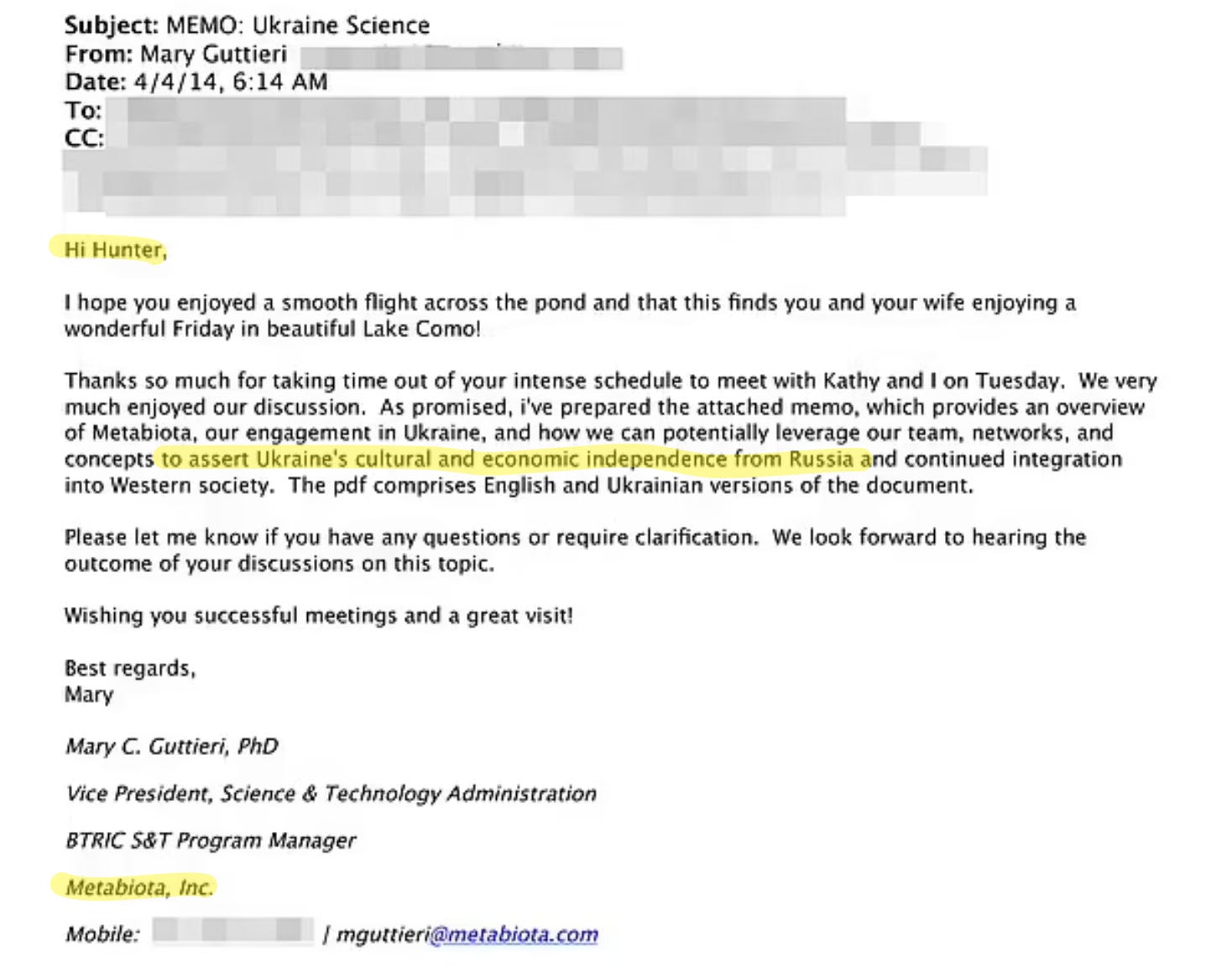 In April 2014, Metabiota official Mary Guttieri wrote a memo to Hunter outlining how the bio-research company could help "assert Ukraine's cultural and economic independence from Russia." Which if you think about it, “independence from Russia” is an unusual goal for a DOD contractor specializing in pandemic-causing pathogens.