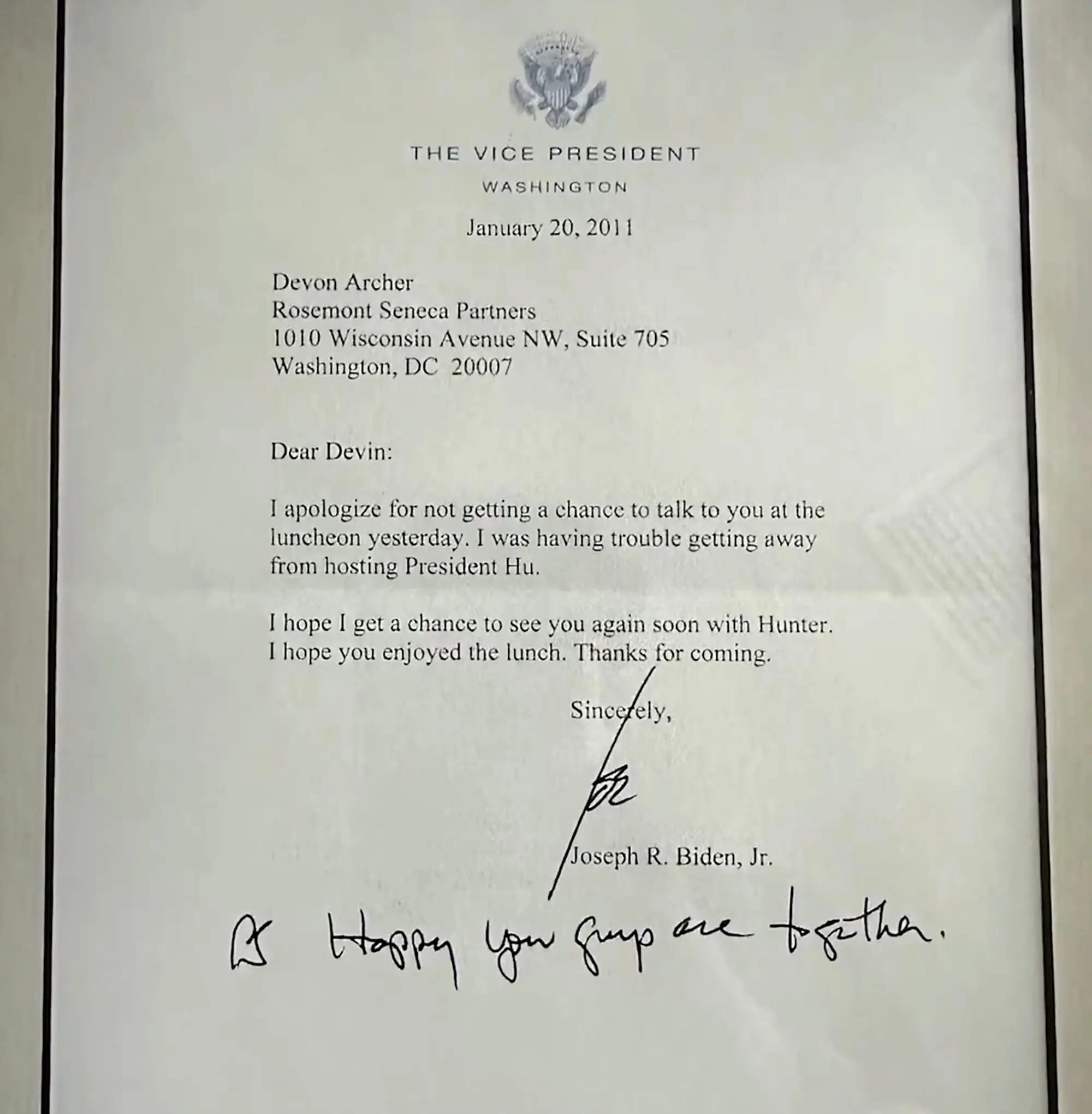 In January 2011, after Devon Archer and Hunter Biden formed shady Rosemont Seneca Partners with John Kerry’s son, then vice-president Joe Biden sent Devon a polite thank-you note mentioning the new partnership: