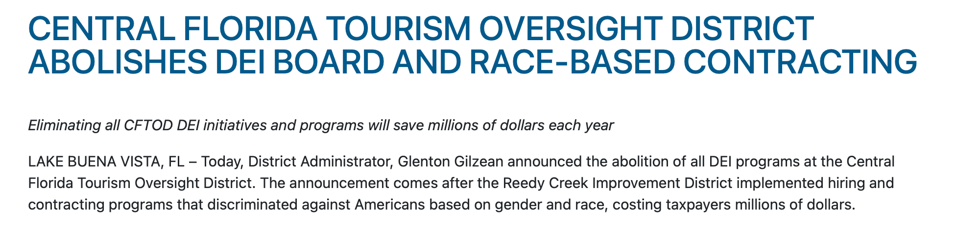 Calling Disney’s DEI rules for the district “un-American,” new District Administrator Glenton Gilzean explained in the official statement that, “Our district will no longer participate in any attempt to divide us by race or advance the notion that we are not created equal.”