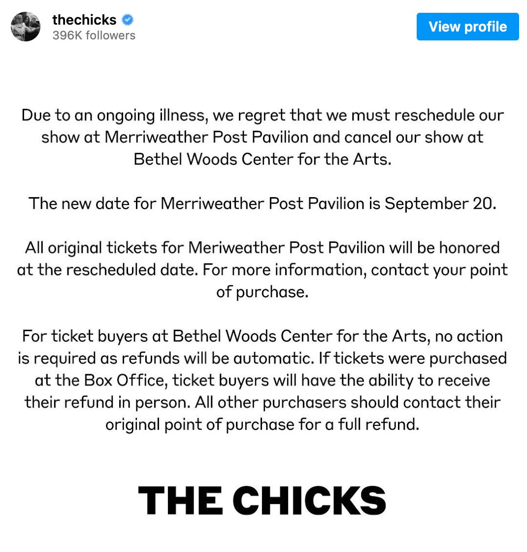 The band has been touring twenty-seven North American locations since June 2022, and was set to continue through October this year. Last week, the Chicks cancelled the Nashville show. Then, scheduled performances in North Carolina and Tennessee were pushed to later dates in August and September, also "due to illness."