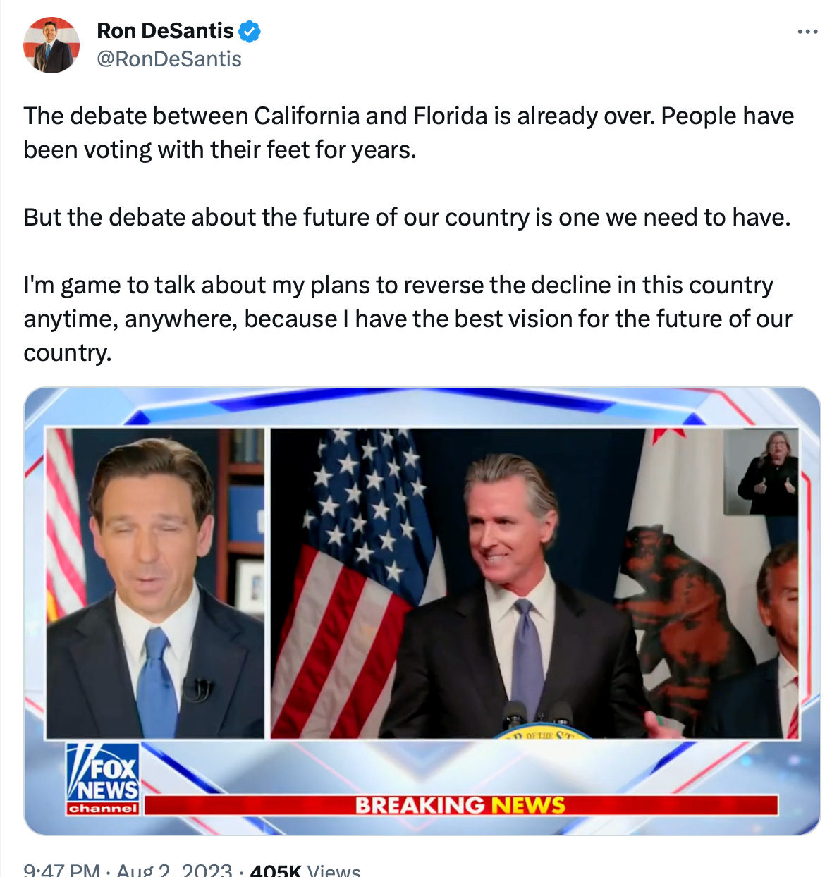 🔥 In related news, in a Hannity interview last night, Governor DeSantis accepted California Governor Gavin Newsom’s challenge to debate the two states’ relative performance.