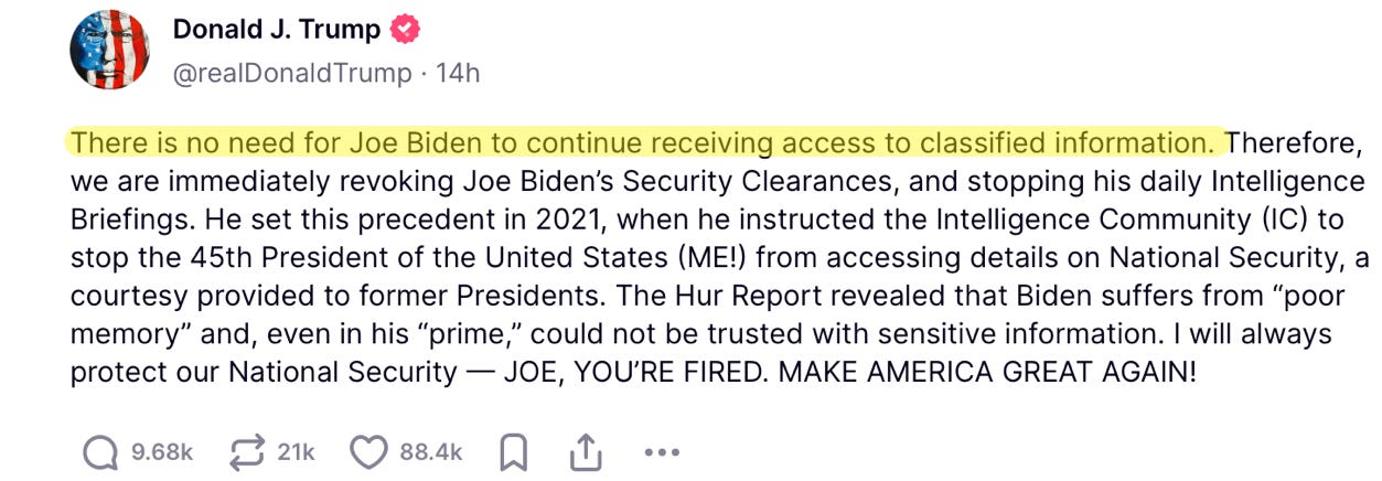 Anyone who is not mentally competent to stand trial for mishandling top secret classified material is not mentally competent to hold a top secret clearance...or any level of clearance for that matter. It's not payback, it's just common sense!