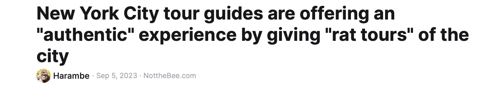 But … New Yorkers are resilient! They are making the most of the Big Apple’s controlled demolition. Another headline, also probably totally unrelated, who knows, I’m sure it has nothing to do with reduced services, was this week’s headline from Not the Bee: