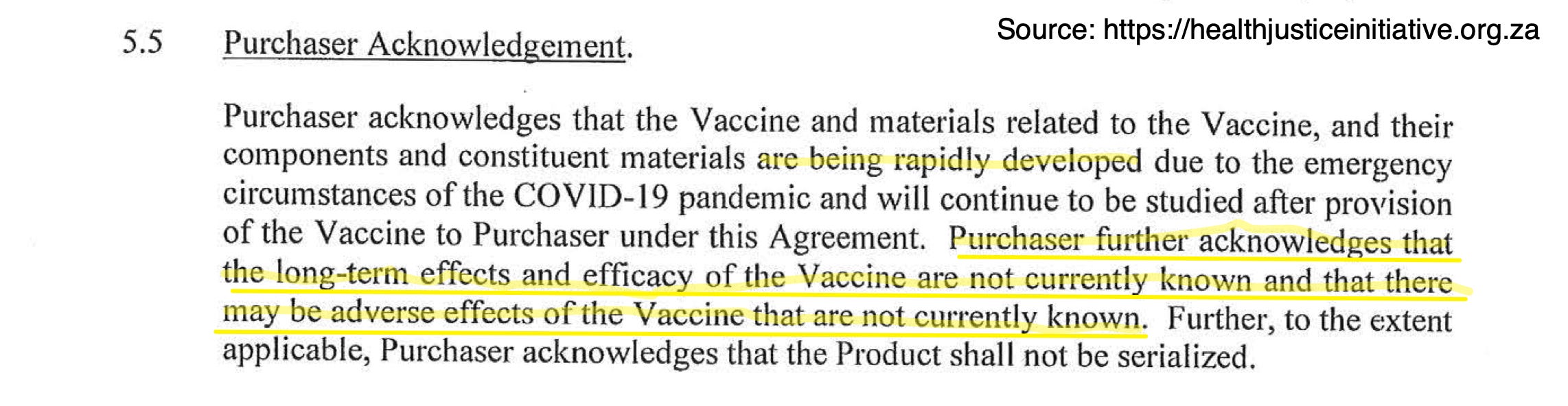 Section 5.5’s second sentence is arguably even worse. It included two different disclaimers. The first disclaimer expressly says that South Africa AGREED that “the long-term effects and efficacy of the Vaccine are not currently known.”