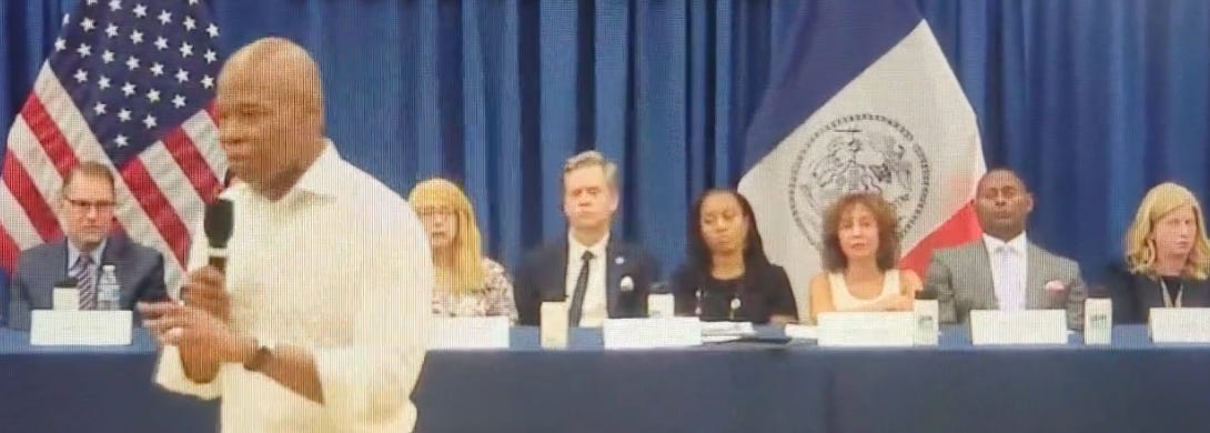 “Let me tell you something, New Yorkers. Never in my life have I had a problem that I didn’t see an ending to. I don’t see an ending to this. I don’t see an ending to this. This issue will destroy New York City. DESTROY New York City. We getting TEN THOUSAND MIGRANTS a month. One time we were just getting Venezuela, now we getting Ecuador, now we getting Russian-speaking coming through Mexico, now we getting Western Africa, now we getting people from all over the globe have made their minds up that they gonna come through the southern part of the border and come to New York City.