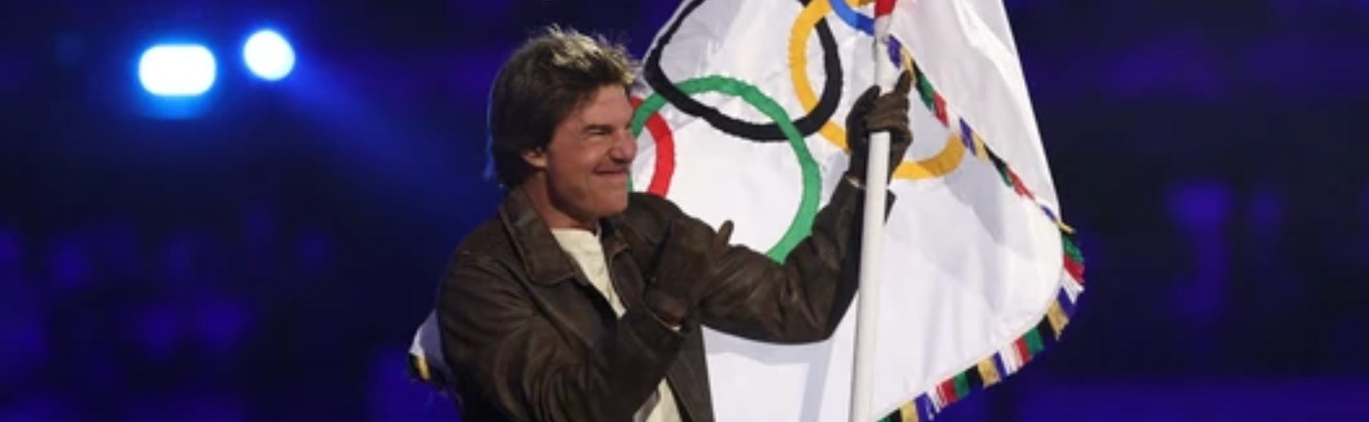 The ceremonies concluded with a much less suggestive and much more dramatic stunt: Tom Cruise, in normal clothes, leaped in from a great height and, riding around on a motorcycle, accepted the Olympic flag on behalf of Los Angeles, the location of the next scheduled games in 2028.