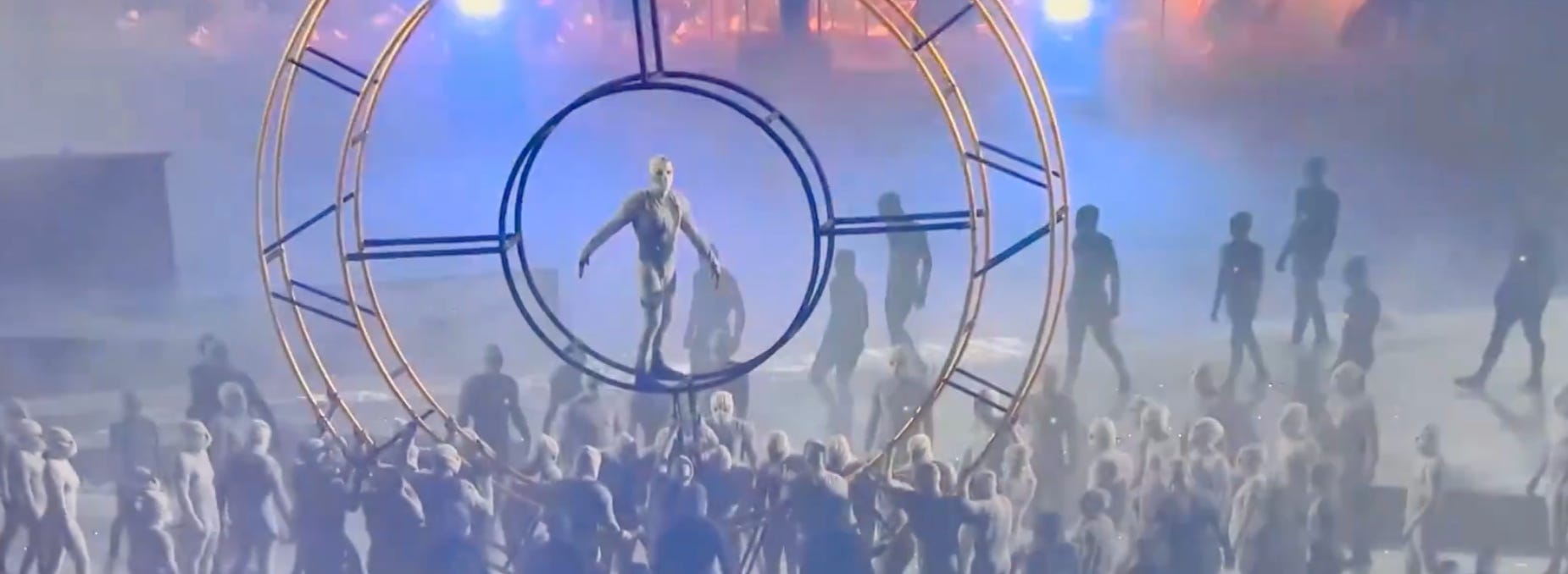 But this time, to avoid awkward misunderstandings, the producers provided their sci-fi-based explanation for the nightmarish ceremony’s elements. The show focused on a descending, skeletal, golden warrior who looked like a cross between a Power Ranger and Edward Scissorhands. Officially, the disturbing, alien-like imagery was meant to evoke Greek gods married to French space-exploration contributions, or something.