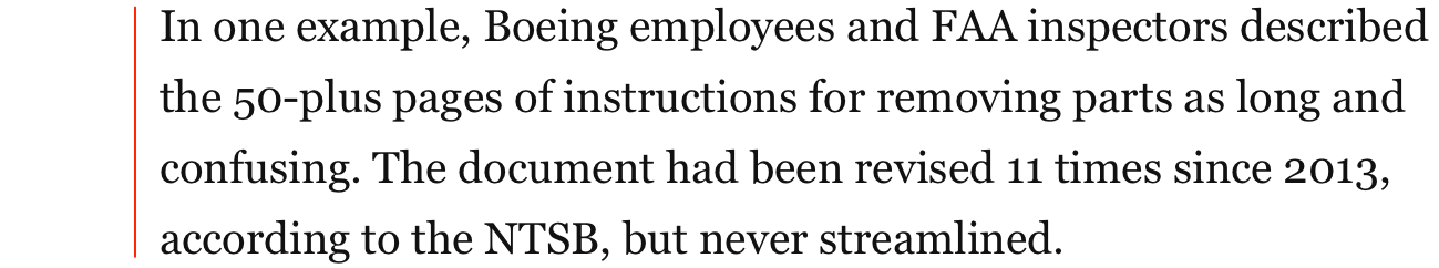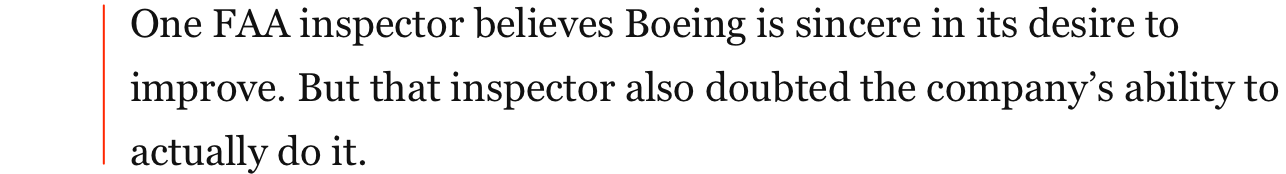We can’t blame the Washington Post this time. The confusion was created by the FAA’s report, which laboriously listed its lengthy diagnosis of Boeing’s ‘woes’ without actually concluding anything useful. The FAA’s insights were often internally inconsistent. For instance, one highlighted problem was workers who won’t follow procedures. But then it identified an equally and opposite problem, management’s over-punishment of rule-breaking workers.