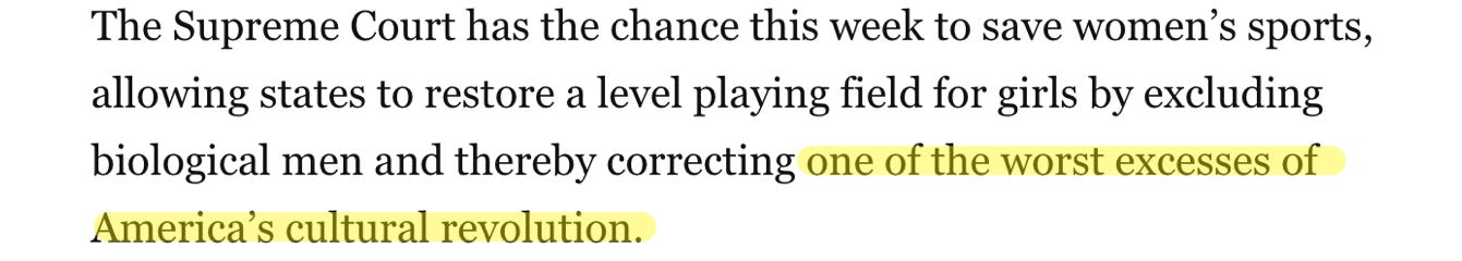 The phrase “cultural revolution” invoked Chairman Mao’s catastrophic Cultural Revolution in China following the communist takeover. If the Democrats at the Washington Post are distancing themselves from trans sports like that, you know it is well and truly over.