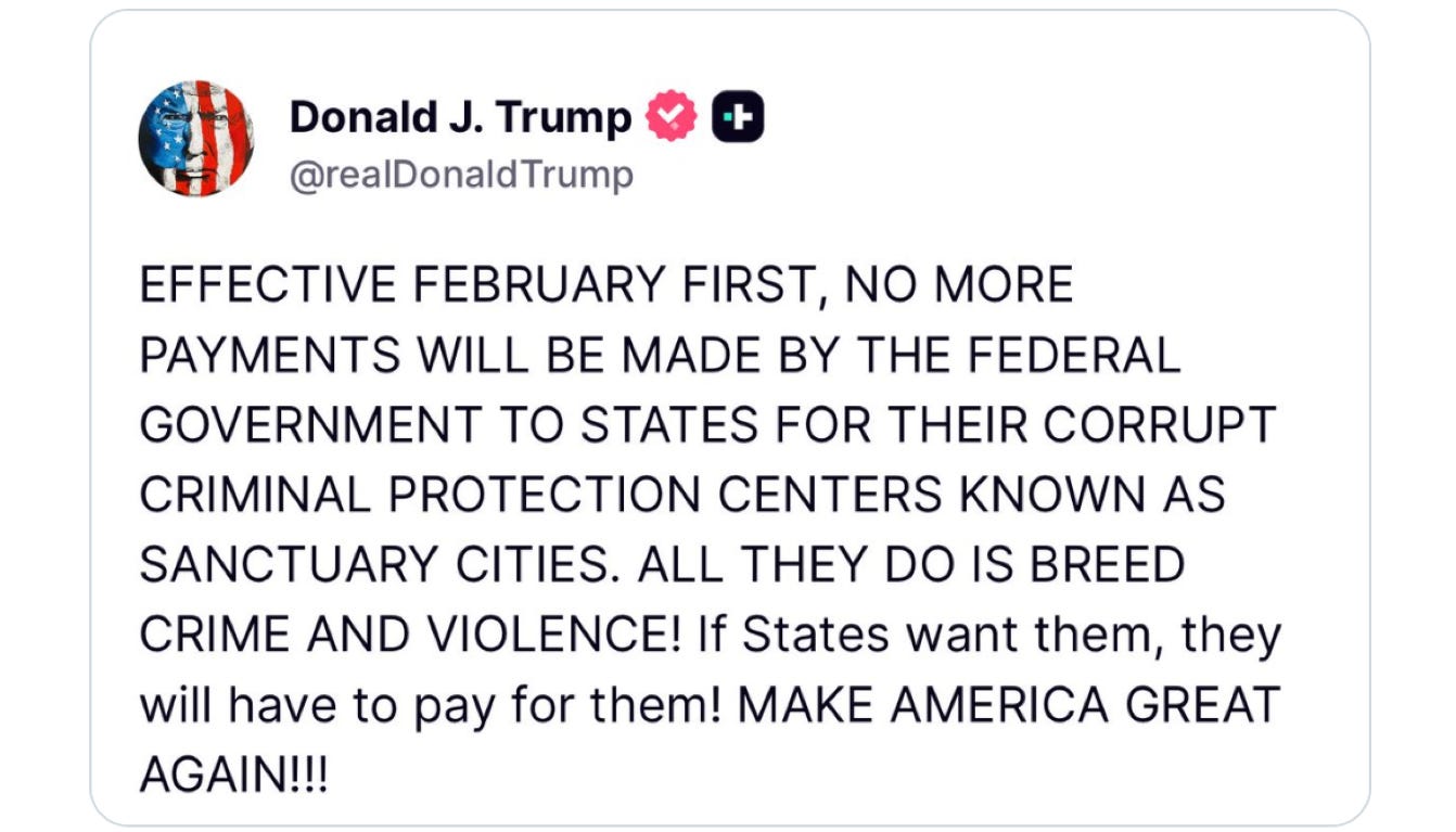 “Starting February 1st, we are not making any payments to sanctuary cities or states having sanctuary cities because they protect criminals at the expense of American citizens,” Trump said yesterday at the Detroit Economic Club, as well as in his post on Truth Social.