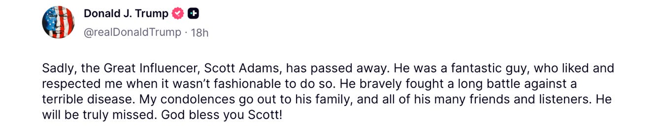Yesterday’s news cycle momentarily slowed and took a gratifying breather. With Scott Adams passing away, we needed a brief break. But I can already feel the pace resuming. Don’t miss tomorrow’s roundup.