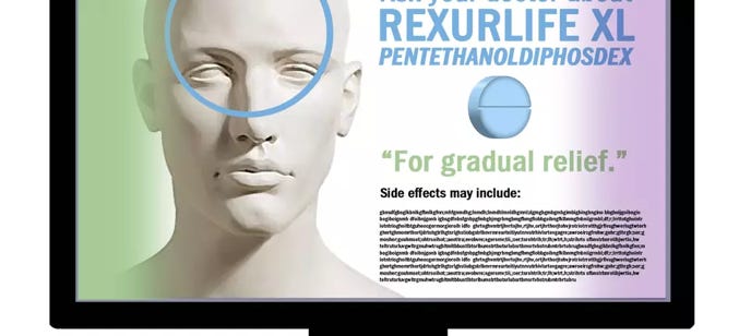 Most of the ads included upbeat descriptions of scary side effects like "serious infections,” “uncontrolled blinking,” “hotdog fingers,” “incontinence,” “risk of suicide,” and “sometimes fatal reactions," while the screen shows blissfully unworried healthy people dancing, playing sports, or strolling on beaches at sunset. Very diverse people, too.