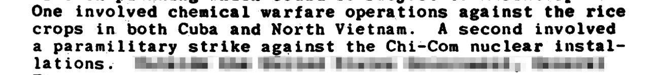 As for the proposed covert chemical weapons attacks against Cuban and North Korean rice fields, well, I described the moral hazards inherent in this kind of starvation operation yesterday. Targeting food supplies is especially shocking because it constitutes a form of biological or environmental warfare, which would have caused severe humanitarian fallout.