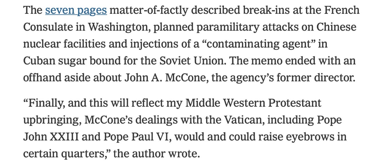🔥 The 1973 memo that began the story warned Director Colby about Elder’s “sinking feeling that discipline has broken down.” Discipline has never recovered. Elder’s memo listed too many examples to recount them all. But my eye was drawn to this particularly shocking part of paragraph four, which described two operations, without stating whether the operations had only been planned or actually went forward: