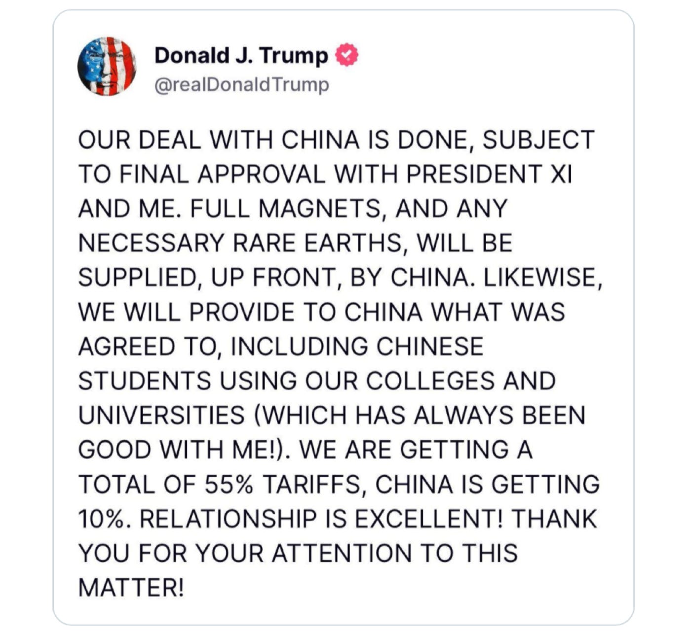 💰 The Journal also reported yesterday that Commerce Secretary Howard Lutnick, standing next to an agreeable Chinese trade negotiator, said the two sides have reached an “agreement in principle.” “I feel really good about where we got to,” Howard said, adding that he expected Trump would be pleased and will approve the deal today or tomorrow.