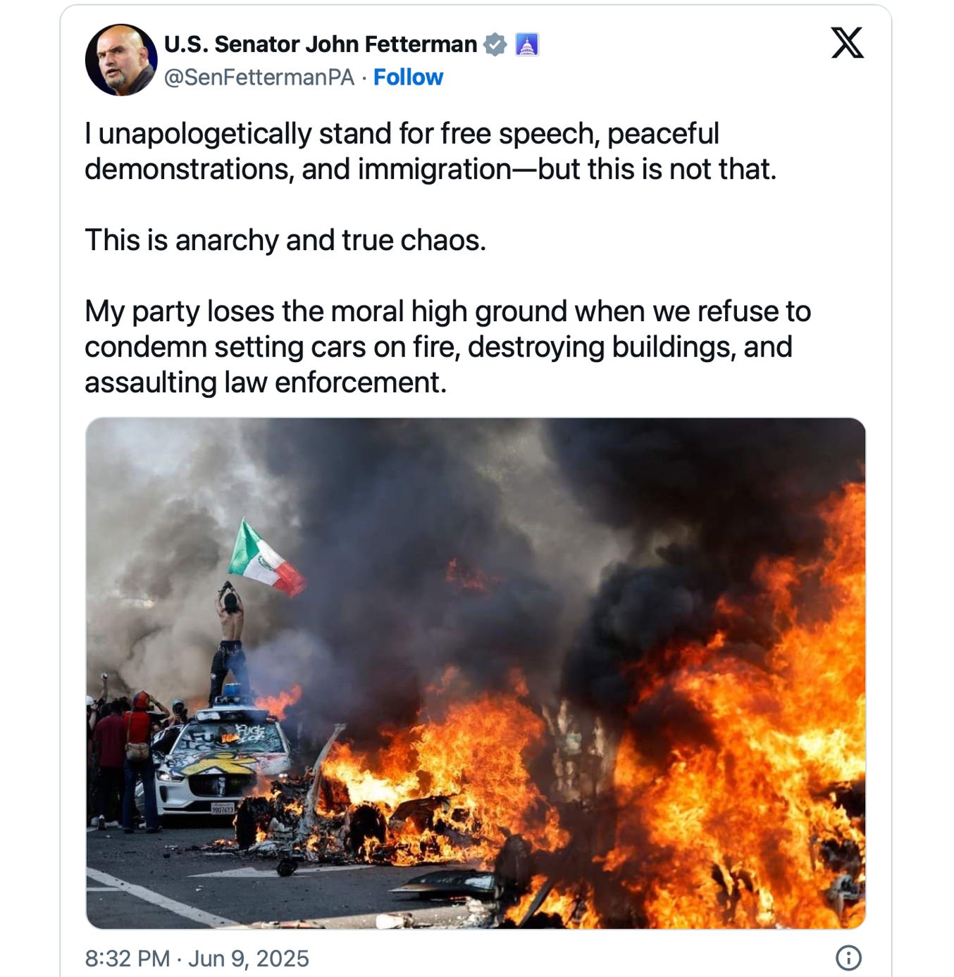 Perhaps even more encouraging, the New York Times timidly included this story in its LA Riot roundup this morning: “As Immigration Protests Grip California, Democrats Enter Risky Political Terrain.” Haha, they’re finally starting to see the outlines of the trap. The sub-headline added, “Scenes of unrest” —unrest!— “have left Democratic leaders worried the confrontation elevates a losing issue for the party.”