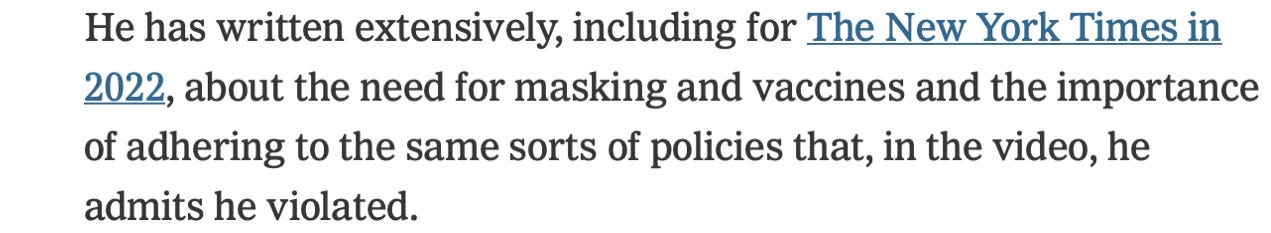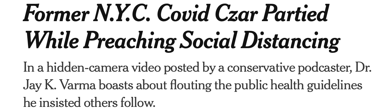 Although the Times rounded up several people to quote for the story, none directly criticized Dr. Vermin, I mean Dr. Varma, except for his hypocrisy in imposing mandates and lockdowns while breaking his own rules: