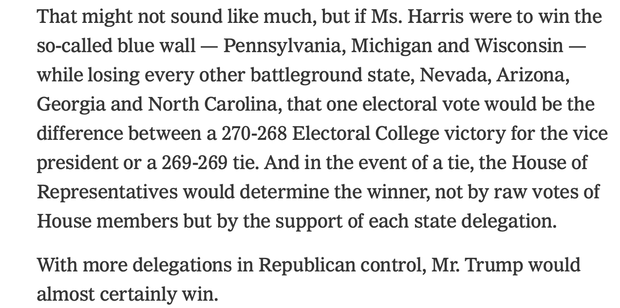 Believe it or not, Nebraska could conceivably decide the 2024 race. It could be that close. Here’s how the New York Times described the math of how a single Nebraska electoral vote (the blue Omaha district) might tip the race in Trump’s favor: