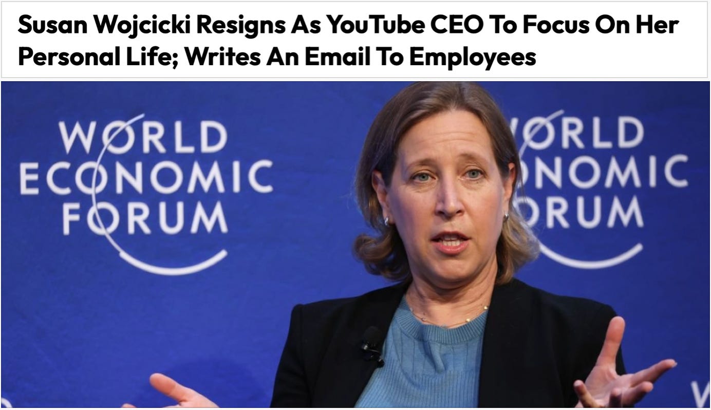 🔥 Another one bites the dust. YouTube CEO Susan Wojcicki is resigning to spend more time with her family. I’m not joking:
