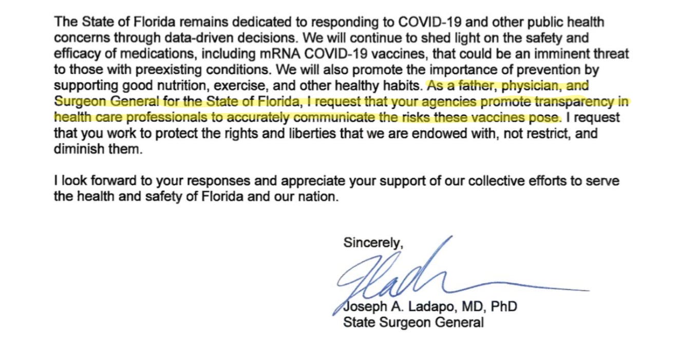 🔥 BOOM. Florida has done it again! And it escalated. Florida Surgeon General Ladapo sent a letter to the CDC and FDA demanding they admit that the vaccines are causing unacceptably-high levels of injury: