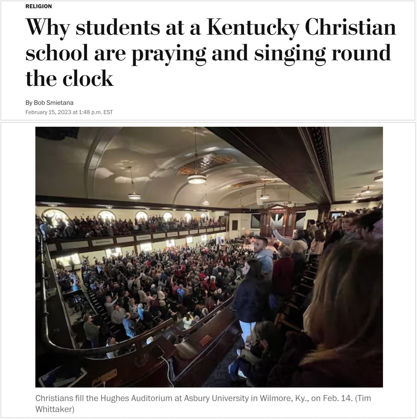 I’ve been meaning to write about this amazing story for several days but breaking news kept filling up the stack. Back on February 8th, a regular chapel service at Asbury college in Wilmore, Kentucky broke out into a Christian religious revival. And it’s kept going, twenty-four hours a day, day after day.