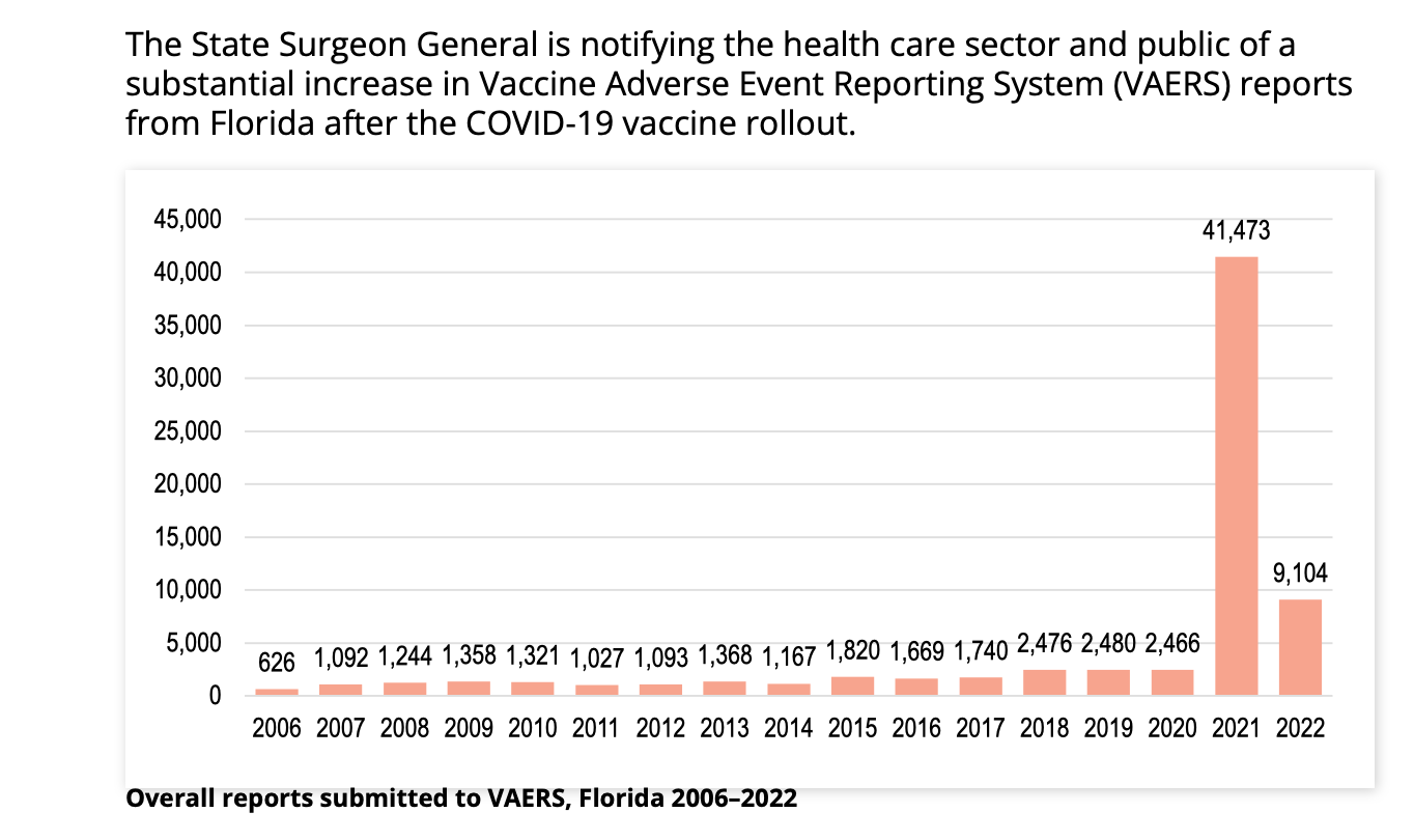 You’re not going to believe your eyes, but on Wednesday, after sending the letter to the federal agencies, Florida’s Health Department also released a “Health Alert on mRNA COVID-19 Vaccine Safety,” which was sent to all Florida healthcare providers. The alert included this chart showing the massive spike in VAERS reports since the mRNA EUA jabs’ rollout: