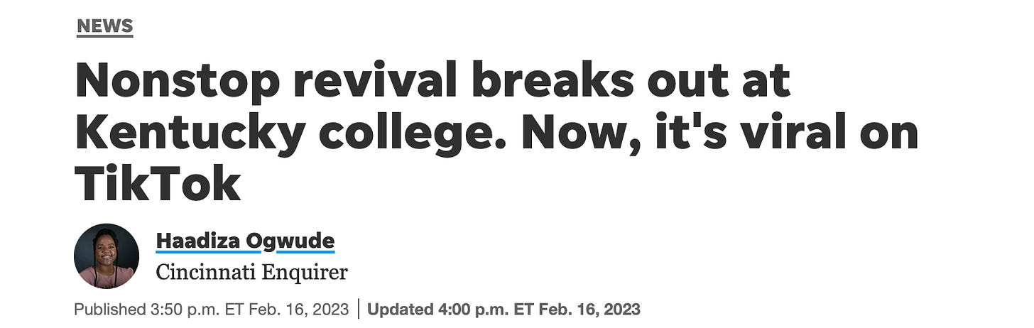 🔥 Yesterday, the Cincinnati Enquirer ran a story headlined, “Nonstop Revival Breaks Out At Kentucky College. Now, It’s Viral On TikTok.”