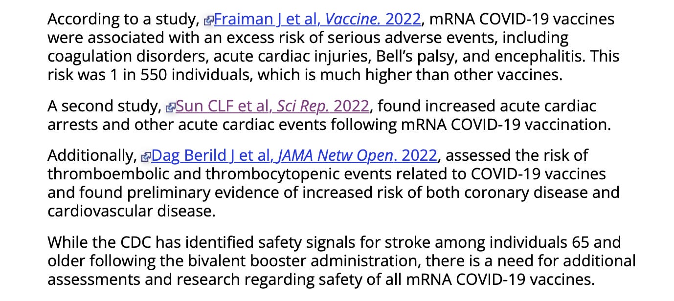 The Health Alert also cited three recent studies (plus the CDC’s anemic stroke advisory) about the risks posed by the mRNA vaccines. Check out how many types of injury were included: