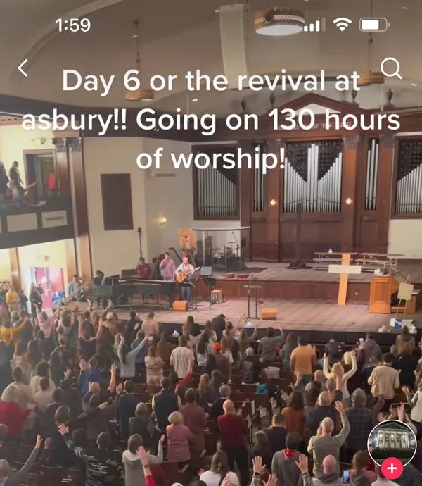 As of yesterday, posts with the #AsburyRevival hashtag have generated 34.5 million views on TikTok. Here's how WaPo described the revival in its article Wednesday: