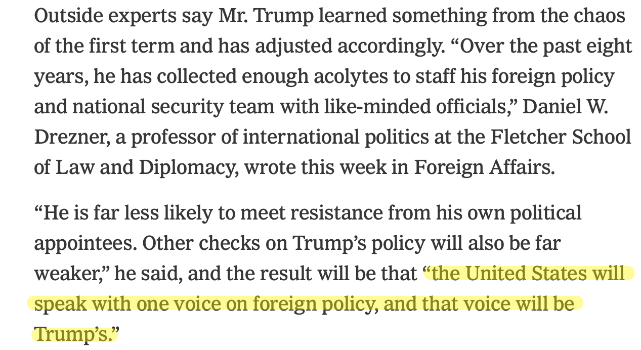 🔥🔥 David Sanger, the New York Times’s “National Security Correspondent” and the voice of the deep-state, ran a thoughtful, cautious story about Trump’s growing list of picks yesterday, headlined “Once They Were Neocons. Now Trump’s Foreign Policy Picks Are All ‘America First.’” It was good news for all sane people who yearn for peace, though oddly, Sanger seemed slightly alarmed at an expected shift from Biden’s aggressive military intervention and regime change tactics to Trump’s style of ‘transactional diplomacy.’