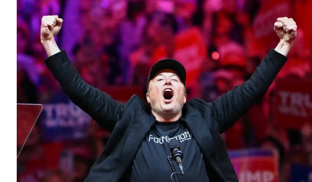 🧑🚀🧑🚀 Elon Musk, who pretty much bet his farm on Trump’s victory, is now a bright rising star. A series of headlines evidence just how good Elon’s bet was. First, Forbes ran a cautiously excited story yesterday headlined, “Trump 2.0 Could Put A Rocket Under SpaceX And The U.S. Space Industry.”