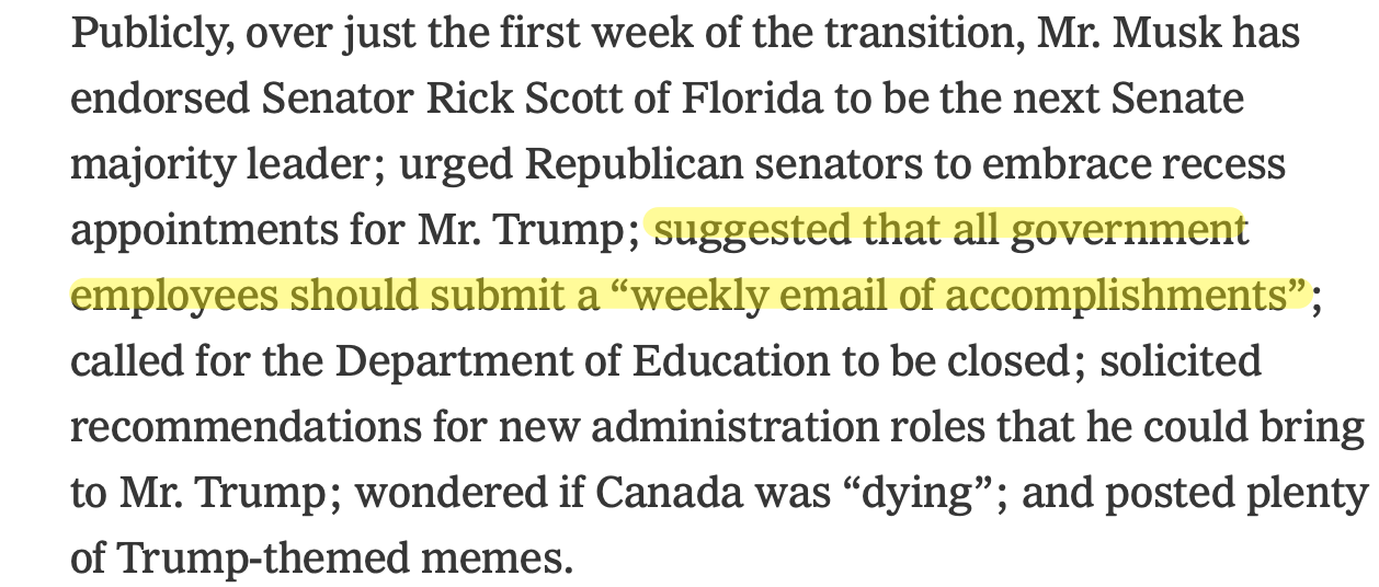 The world’s most transformative technologist is well-positioned to follow through on that astonishing dream. But you just can’t please some people. The New York Times’s top story this morning was headlined, “At Mar-a-Lago, Elon Musk Puts His Imprint on the Trump Transition.” The sub-headline sneered, “He’s on the patio. He’s on the golf course. Everywhere Donald Trump looks, there is the world’s richest man.”