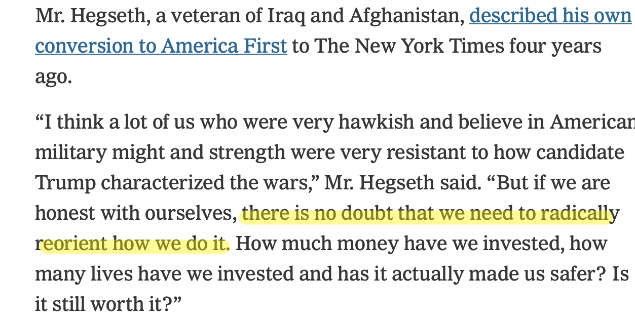 The article quoted Pete Hegseth (from 2020) describing how he abandoned his “hawkish” military-first foreign policy, developing a more mature, Trumpian worldview based on America First economics rather than clobbering your competitors with a rock while they aren’t looking. In Pete’s words:
