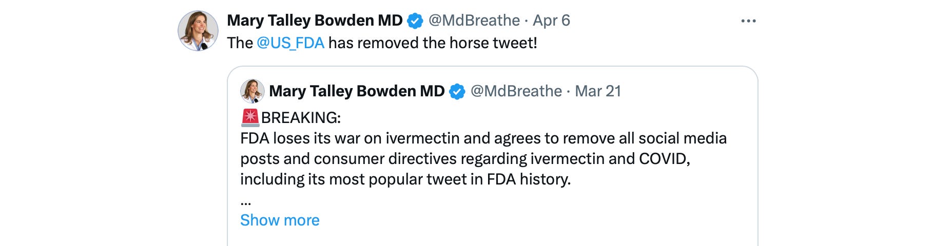 🔥 Yesterday, complying with the massive health agency’s settlement of a lawsuit brought by a handful of independent doctors including the terrific Dr. Mary Talley Bowden, the FDA finally took down its ridiculous — but folksy! — “you are not a horse, ya’ll” tweet defaming ivermectin:
