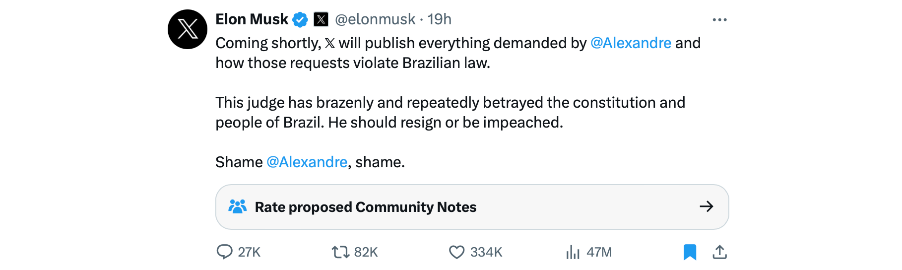🔥 It was perhaps only a matter of time. CNBC ran the story early this morning (2am) headlined, “Brazil Supreme Court justice opens inquiry into Elon Musk, escalating dispute over misinformation.” It’s a cage match: Elon versus the country of Brazil.