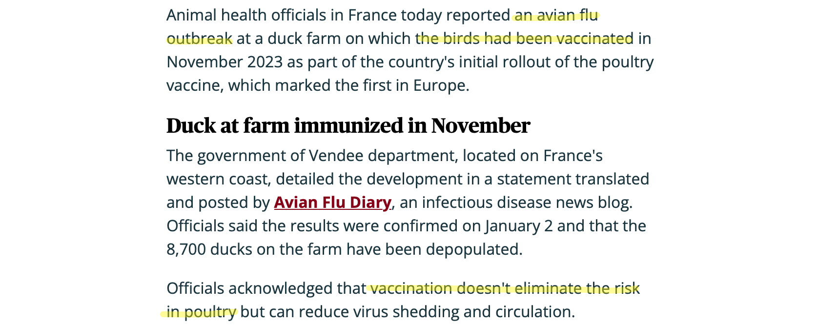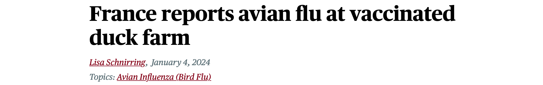 Hahaha! Vaccination doesn’t eliminate the risk! Where have we heard that one before? Soon they’ll be telling us okay, maybe it won’t stop infection, but it still reduces serious disease and death. In birds. By some unknowable and unquantifiable amount. Just trust them.