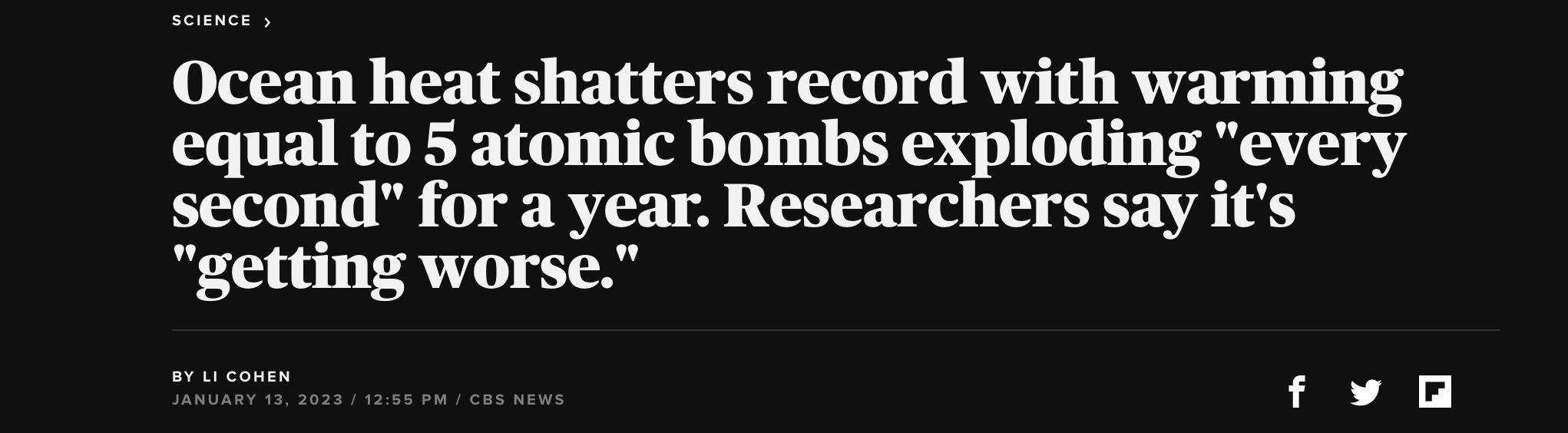 The Bulletin of Atomic Scientists recently calculated the dramatic increase in ocean temperatures from 1971 until now, also putting it in alarming nuclear terms: “Since 1971, the Earth has absorbed the heat equivalent of over 6 billion atomic explosions of the size that decimated Hiroshima in 1945, give or take a few explosions.”