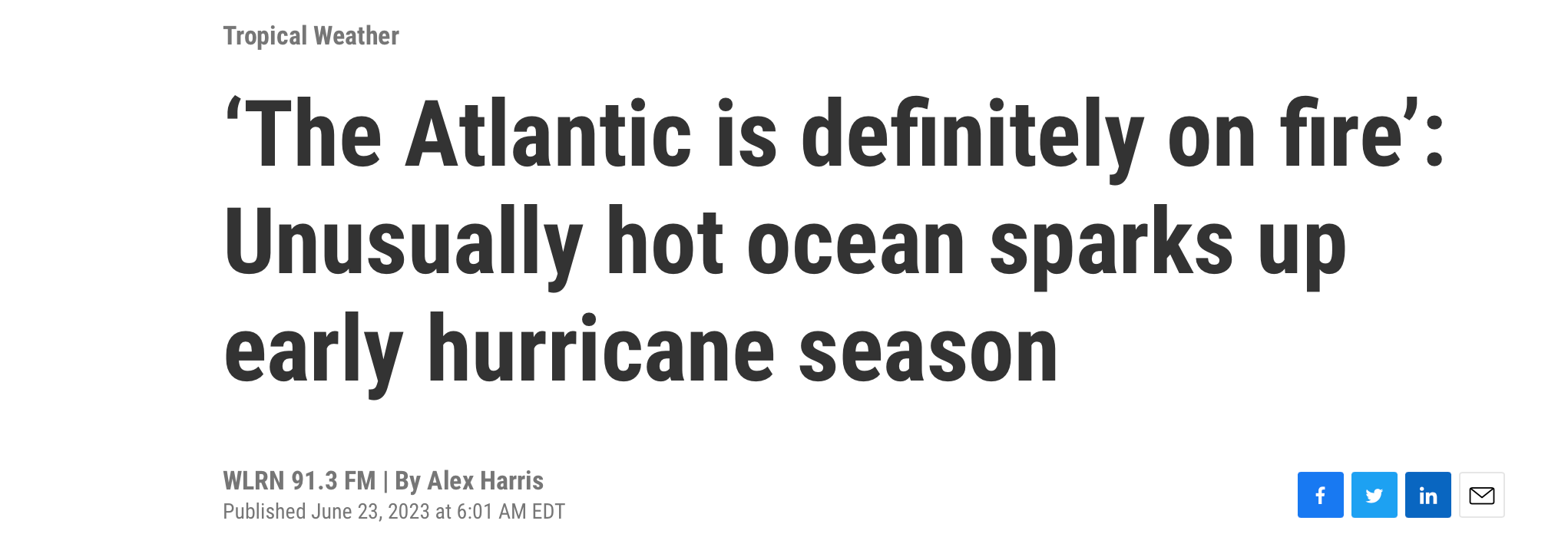 The quote came from a marine scientist. “The Atlantic is definitely on fire,” said Micheal Fischer, an assistant scientist with the University of Miami-NOAA Cooperative Institute for Marine and Atmospheric Studies, providing the alarming language in the headline. He didn’t mean a proper fire, or that the ocean is now a giant all-you-can eat bouillabaisse.