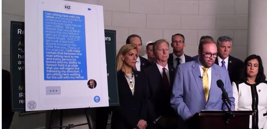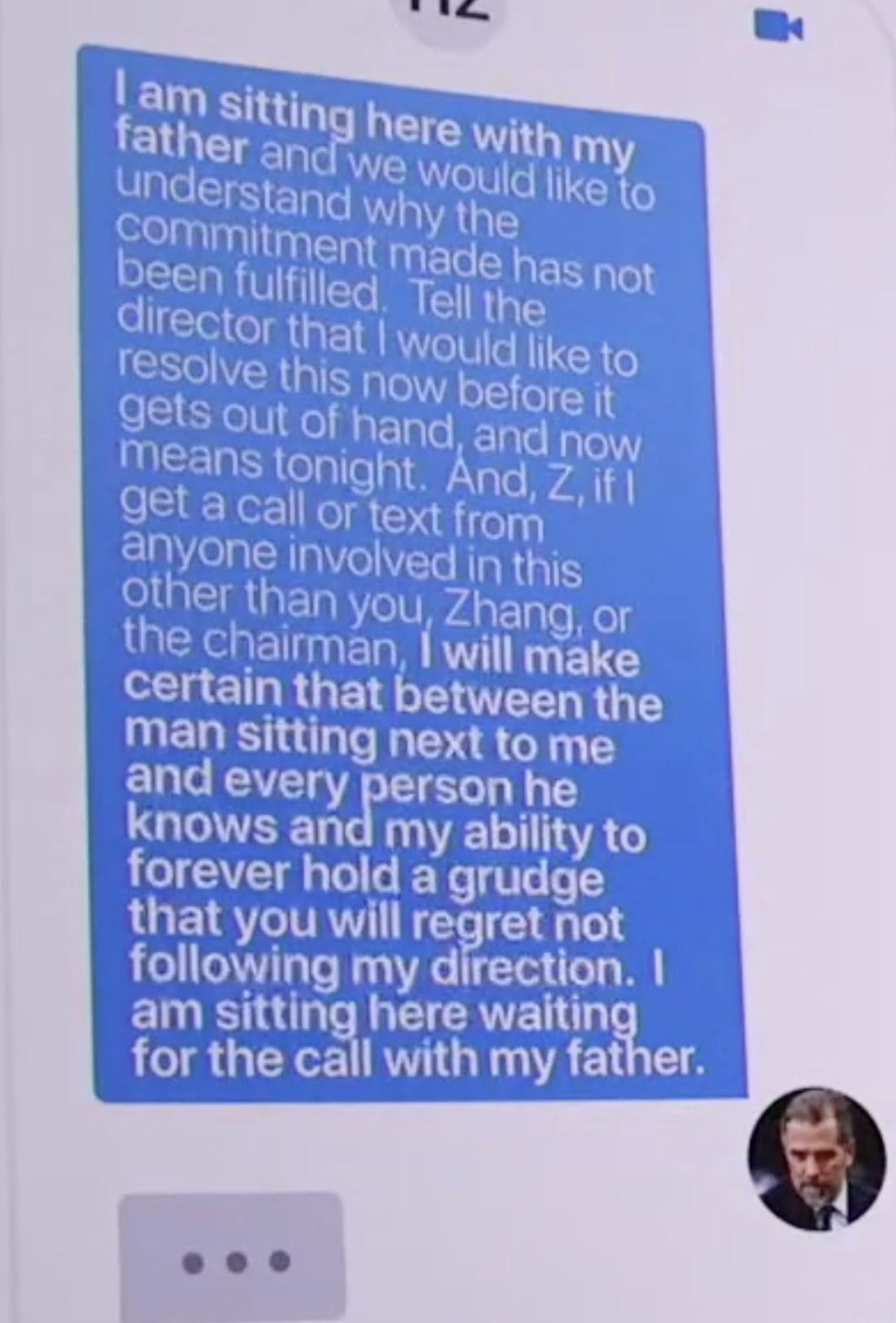 Shapley also disclosed evidence that is perfectly consistent with the Oversight Committee’s Biden Bribery case investigation: a WhatsApp message that Hunter sent to a Chinese official, obviously shaking the official down for cash, and — this is key — warning that “my father is sitting right next to me.”