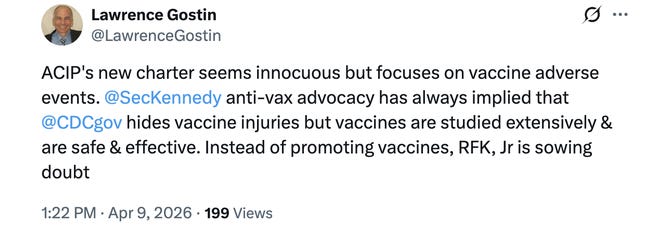The HHS spokesperson called it “routine statutory requirements” that “do not signal any broader policy shift.” That is technically accurate yet functionally misleading. Certainly, the institutional players don’t believe it. Richard Hughes, a lawyer for the medical groups that sued to shut Kennedy’s committee down, called it “a calculated effort to shift the focus and balance of the committee to advance an anti-vaccine agenda.”